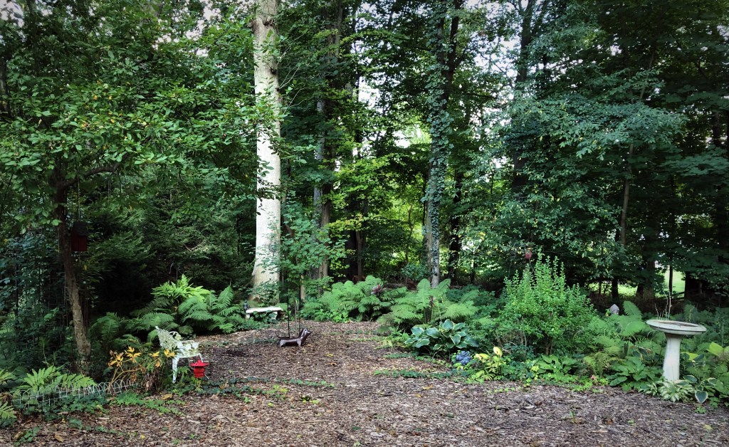 The second photo is my back woodland garden taken from the same angle by me this afternoon. It is September so you can’t see the bulbs and azaleas, etc. But you can see how the trees have grown and where we removed the grass. The grass given the trees was not so much fun to grow, so we opted for wood chips. I also never knew the family who build our home had a big old bird bath, let alone one close to the location of my own bird bath.