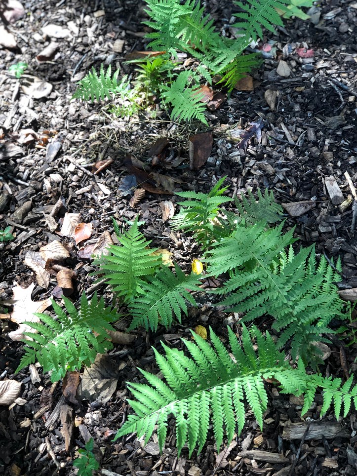 These plants don’t include anything I might wish to move. One thing that will get moved are some baby ferns that popped up outside their flower bed in the wood chips. I also have more wood chips to put down.