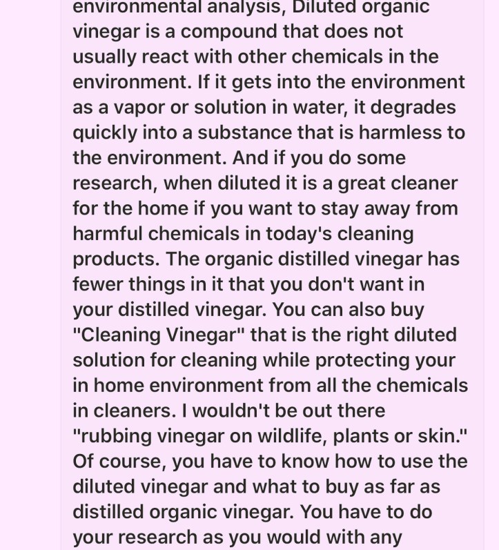 I remarked to two of the people that vinegar is an acid and caustic. It’s caustic to wildlife, other plants, domestic animals, and humans.