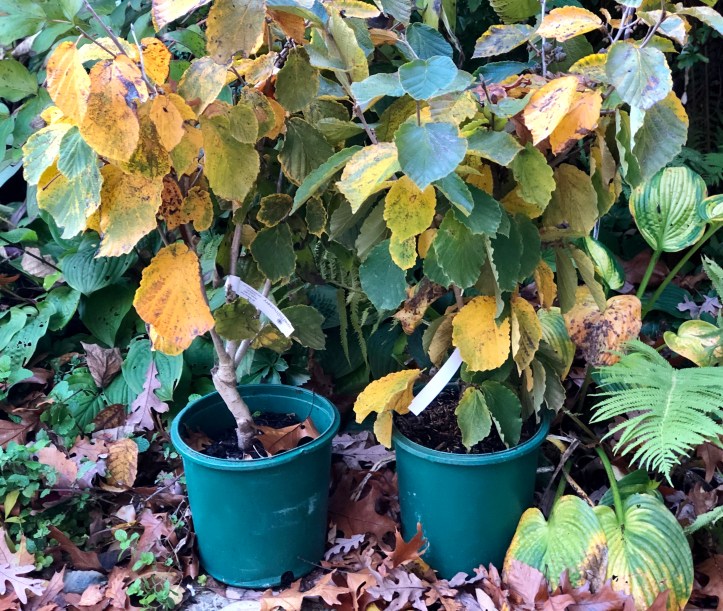 Also left to be planted are two beautiful witch hazels called “Strawberries and Cream”. They will bloom mid to late winter and will have yellow spidery blooms with soft red centers. They came from Rare Find Nursery.