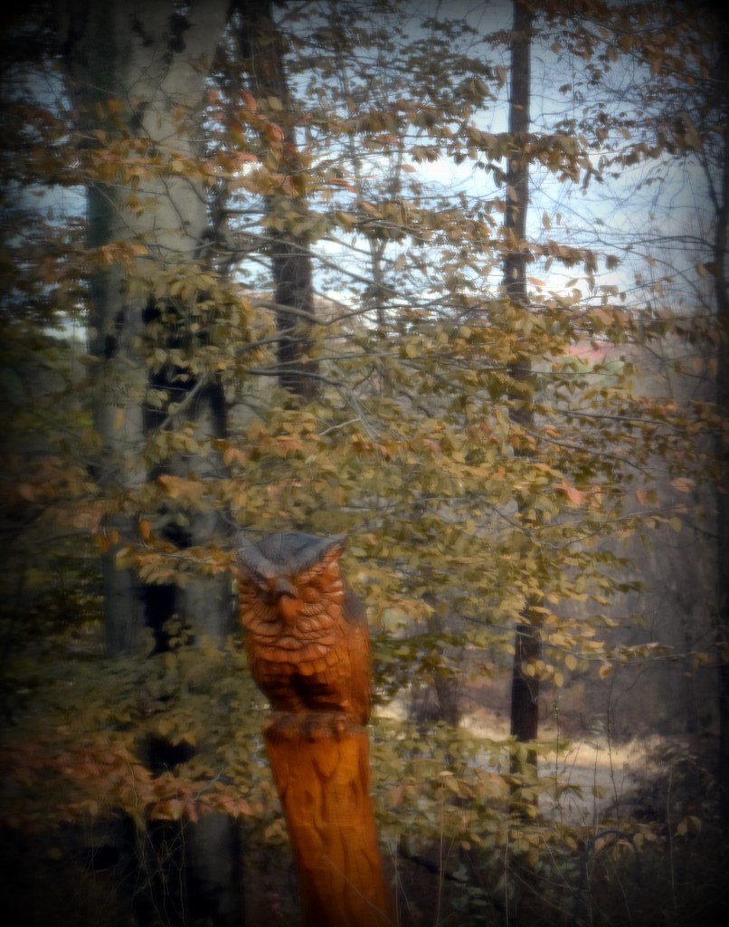 The last photo is our carved owl, the surprise of our wood’s edge. What else do you do after you have to bring down a 320 foot red oak stretching perilously over a good percentage of your home? This owl was carved by local artist Marty Long. He’s amazing!