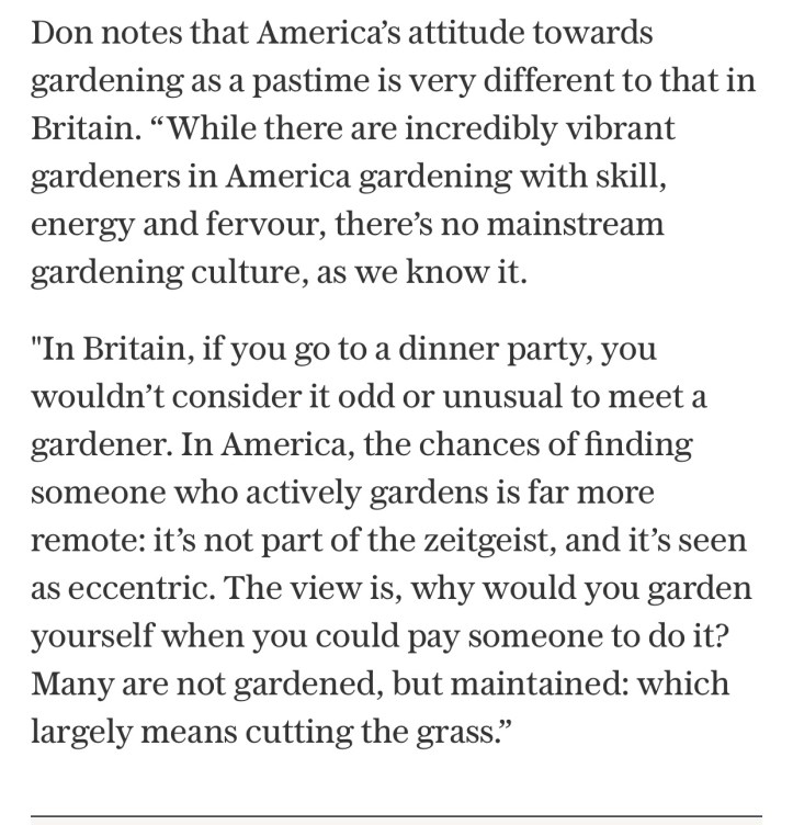 What you see above are three screenshots of the article which is so worth reading in it’s entirety because he speaks the truth. I was embarrassed as an American gardener to read this, but he’s not wrong. I know people think I am off my rocker for spending so much time gardening.