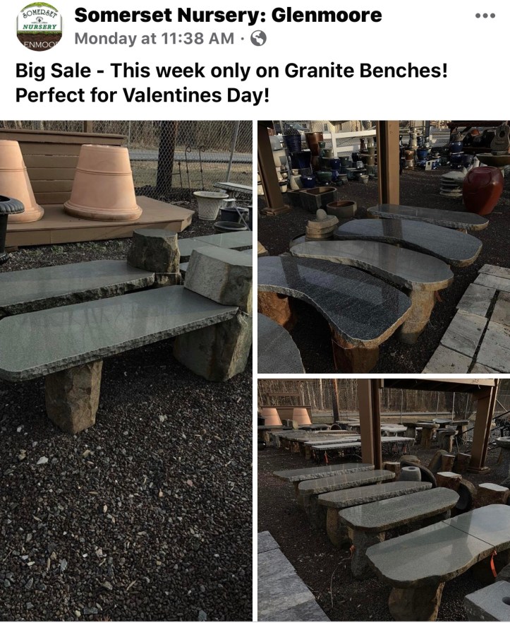 Somerset Nursery in Glenmoore, PA is having a pre-season sale on concrete and granite benches. They posted on their Facebook page earlier this week.