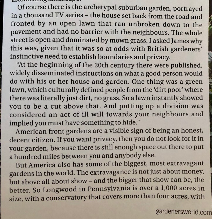 I do think while Monty Don alluded correctly to the lawn obsession in lieu of a garden here in the US, to me that is not a garden or gardening… it’s a lawn. Often propped up by chemicals and obsessed over. I love my neighbors, but with a couple of the men where I live, it seems to be this unspoken competition of the lawn. Mowing it, blowing leaves off of it, getting it treated. If one comes out, the other then comes out.