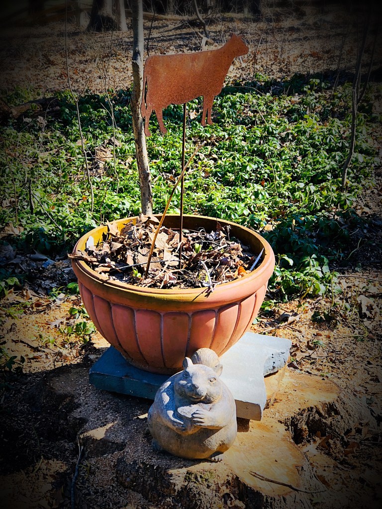 Today I also used my garden cart and moved a piece of slate I had waiting to put on top of the stump that is remaining of the dead tree we just took down. I needed something heavier than the piece of sliced log. I also relocated Chubster the Squirrel I bought from Brandywine View Antiques to the stump to sit just in front of the pot.