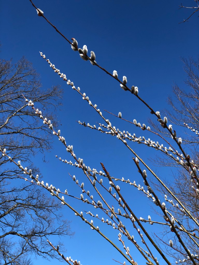 The pussy willows are busting out all over. Ever since I was a little girl they have been one of my favorite things. The giant Chinese pussy willows I bought from Applied Climatology at the West Chester Growers Market a few years ago are reaching for the sky! They tolerate so much and basically I give them a good hack after they have bloomed and maybe a couple of other times throughout the summer and they stay in decent height control.