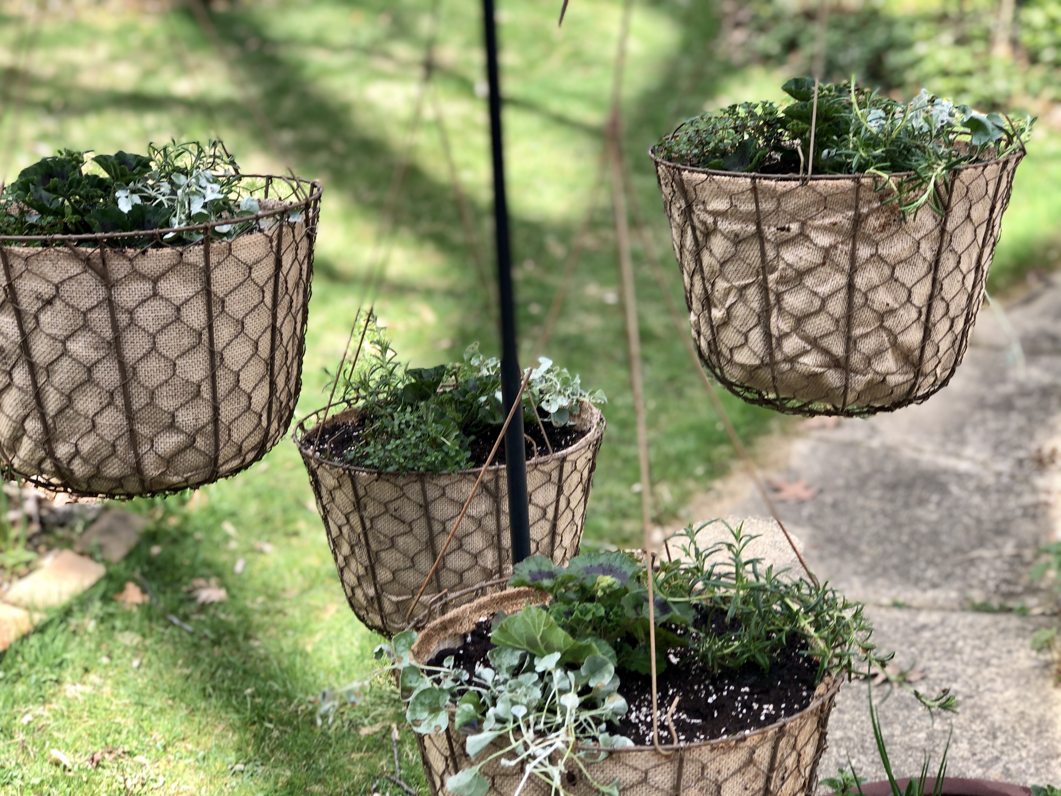 From this point it’s pretty simple. I add my plants one by one. I build up the soil around the plants until everything is set. Today after I planted my baskets, I added the hangers, and hung them up. I watered the plants in with a mixture of water and seaweed extract.
