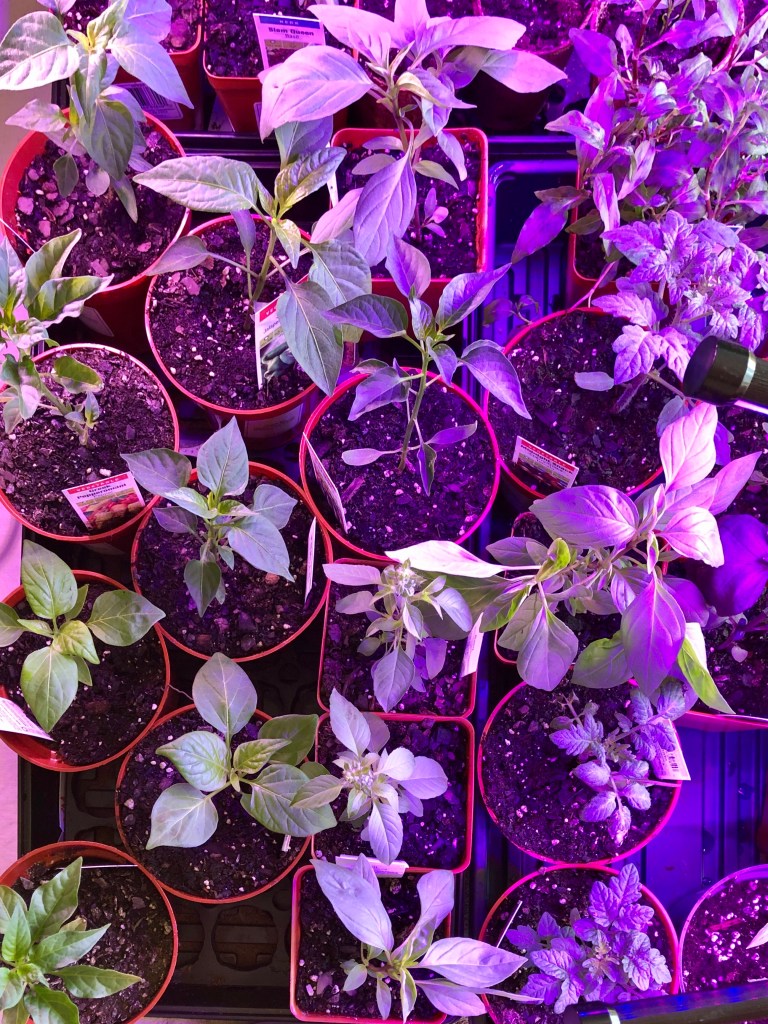 My dining room table looks like a plant nursery. Various basils, tomatoes, hot peppers, even lemongrass and Vietnamese coriander (rau răm). Plants I have grown from seed and plants I purchased. All too small or too tender to live outside. They are slightly disco colored because of the plant lights being on – everything is actually NOT purple!