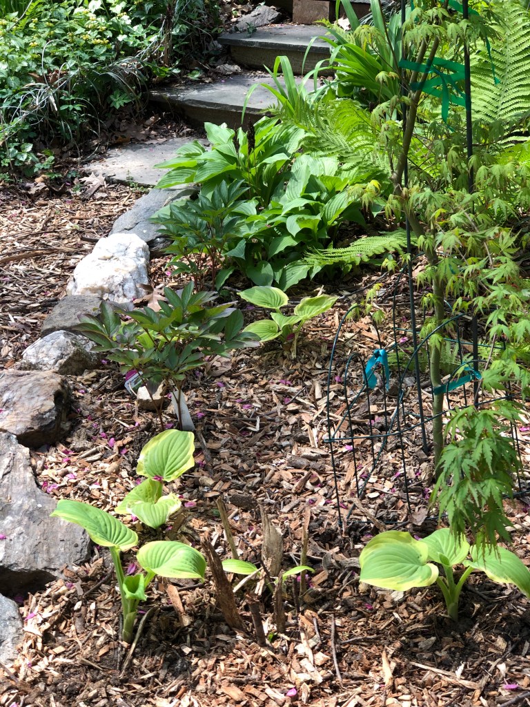 The hostas were quickly dug into the new bed or bed extension I recently completed when I planted the green strap Japanese Maple.