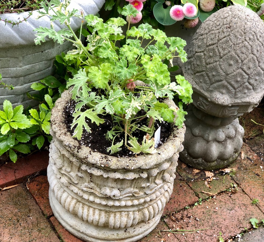 Yesterday we were finally able to pick up (contactless in our COVID19 world) an old concrete pot I had been waiting for since a friend sourced it for me in late March. This is the last pot I am planting and it has become the home for scented geraniums in it from the Philadelphia Unit of the Herb Society of America contactless plant sale.