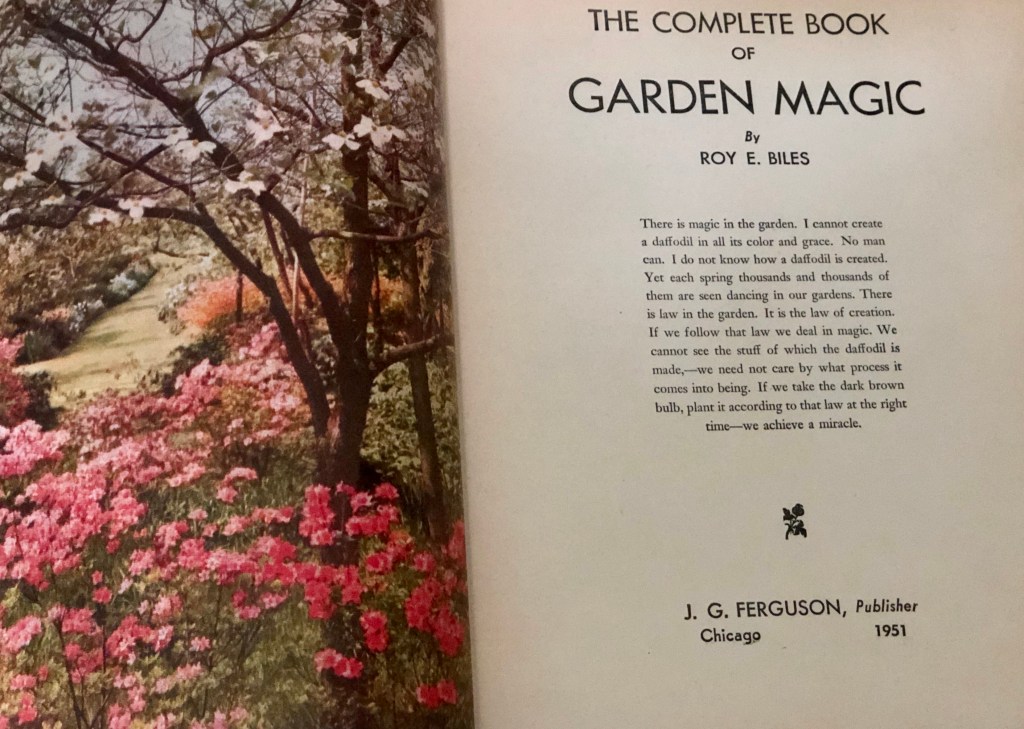 Then I came in. It’s a little gloomy grey and dampish out. I realized I had never gone through a vintage garden book my friend Kristin gave me. The Complete Book of Garden Magic by Roy E Biles published in 1951. It’s amazing!