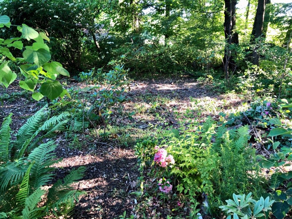So I planted them over in this area with two other rhododendrons and viburnum and a couple of transplanted ferns. Now you really can’t see what I planted in this photo. I am far enough back with the photo that it just looks open.