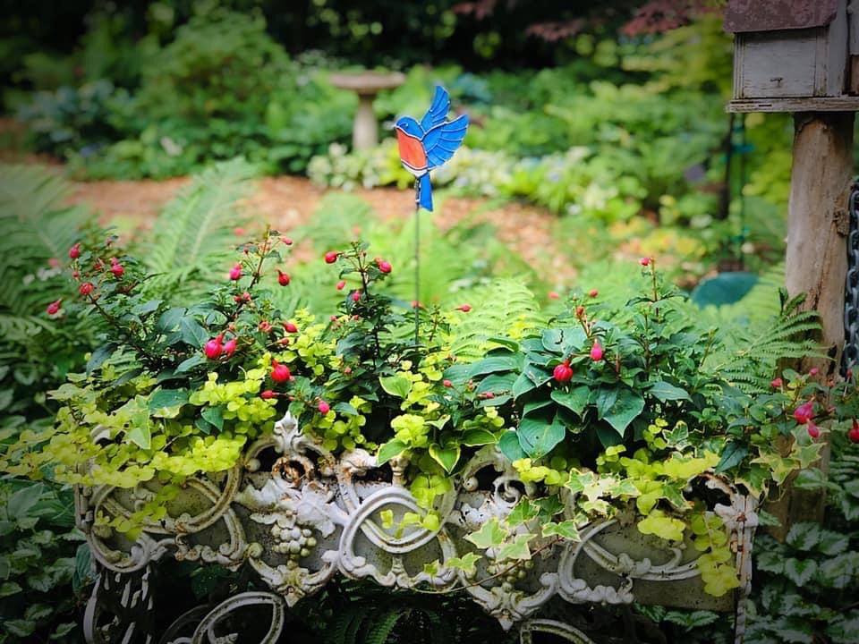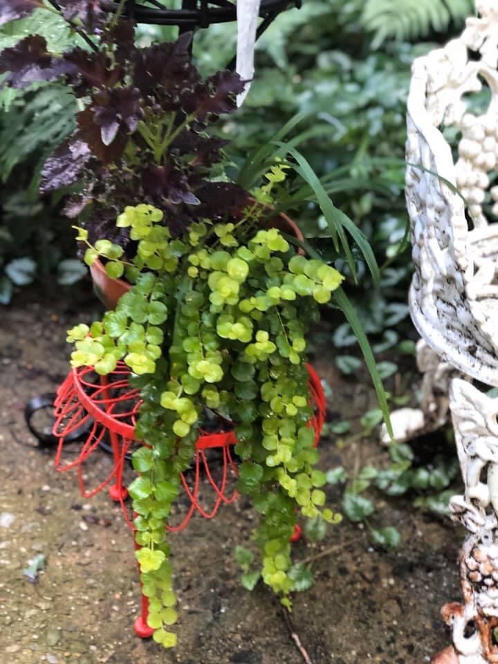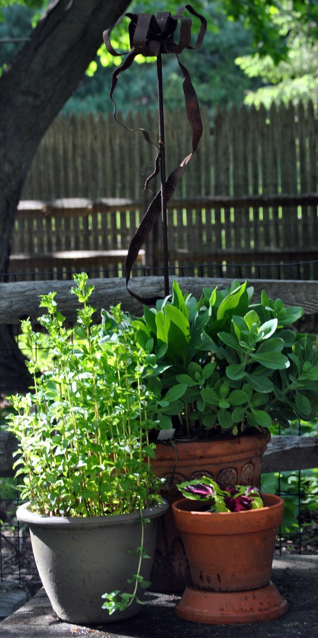 I will also plant vegetables in pots. Chili peppers, onions, tomatoes, and celery. I don’t have room for tomatoes in my flower beds and as we are partially in the woods I don’t actually have a lot of full sun. I use these wrought iron rose supports I have to grow my tomatoes in pots and I underplant with more herbs, especially different basils.