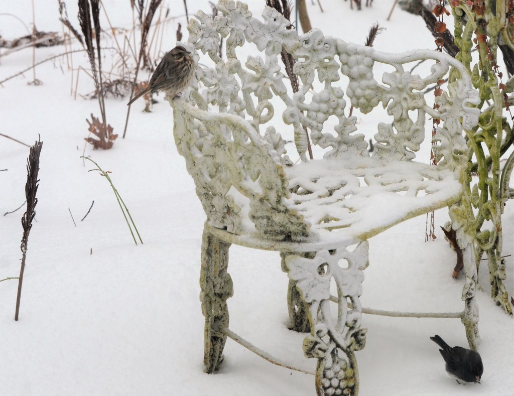 The birds are everywhere. At the feeders, scratching the snow for other nibbles and they sing quite brightly even in the snow.