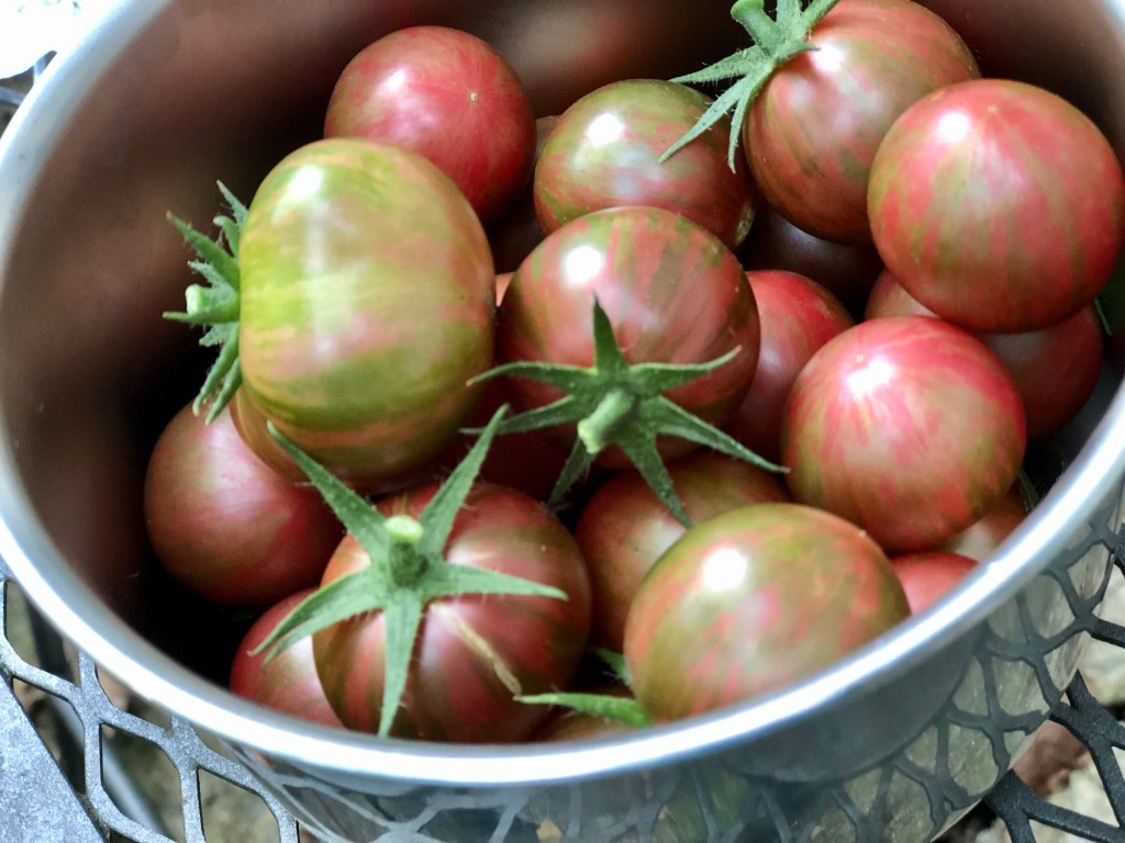 Today’s tomato harvest were the cherry tomatoes. Bumblebee is what I grew this year. They are OK but they have a bit of a thick skin and I think I am going back to midnight snack next year because they are just more flavorful.