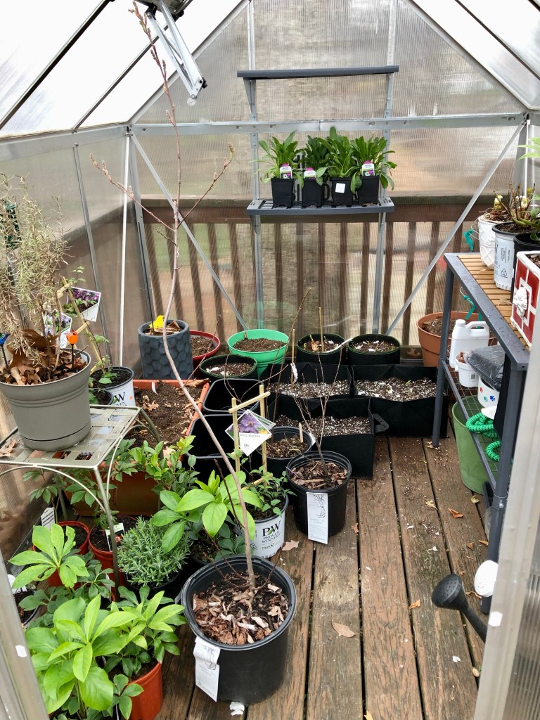 Plants arrived from BloomBox this morning. I didn’t really order things that were susceptible to cold, but except for a cedar tree, I did plop things into my unheated greenhouse to join other residents. As long as I have the room, that’s fine, but once I start my seeds and have seedlings and have to plant my chili peppers all temporary residents will come out.