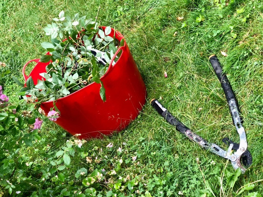 I’ve now reached a lot of the maintenance part of the growing season. Lots of deadheading. Basically with the rosebushes I pick a different rosebush every day to deadhead. I also am doing things like growing potatoes in pots for the first time so I have to keep an eye on their soil level.