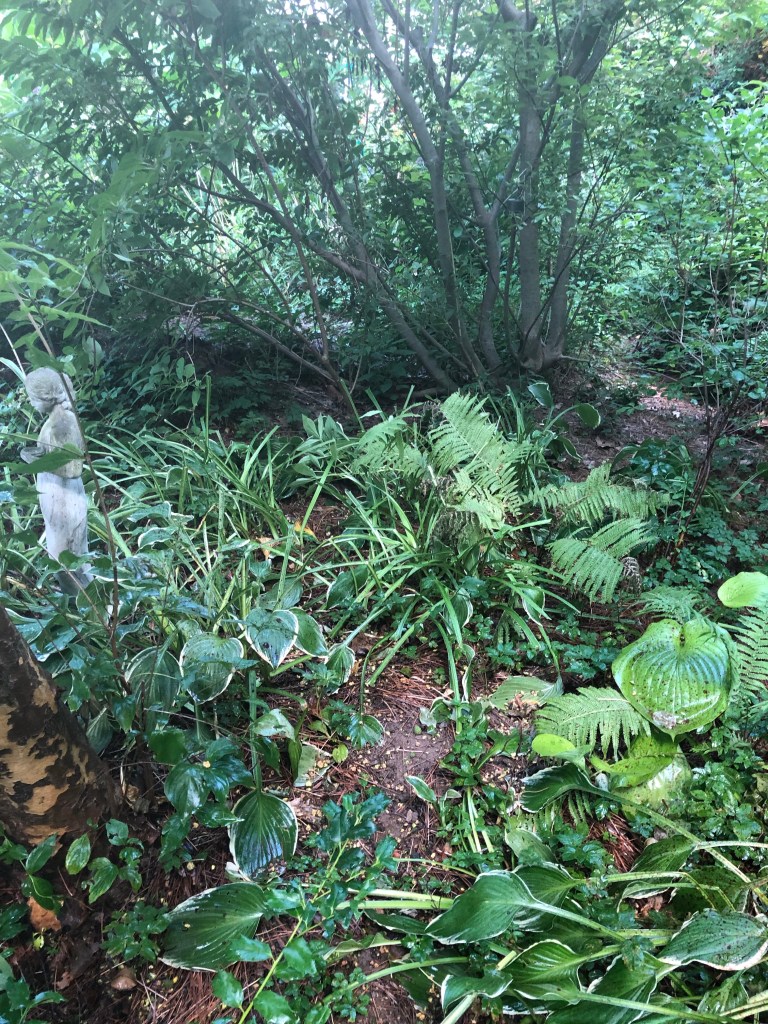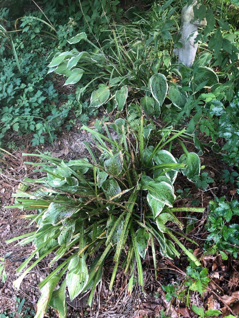 The deer and I are going to have words. There is a mini herd of six or so they keep hanging out in my woods. The other day they had a hosta and azalea salad in the woodland edge bed called the derecho garden.