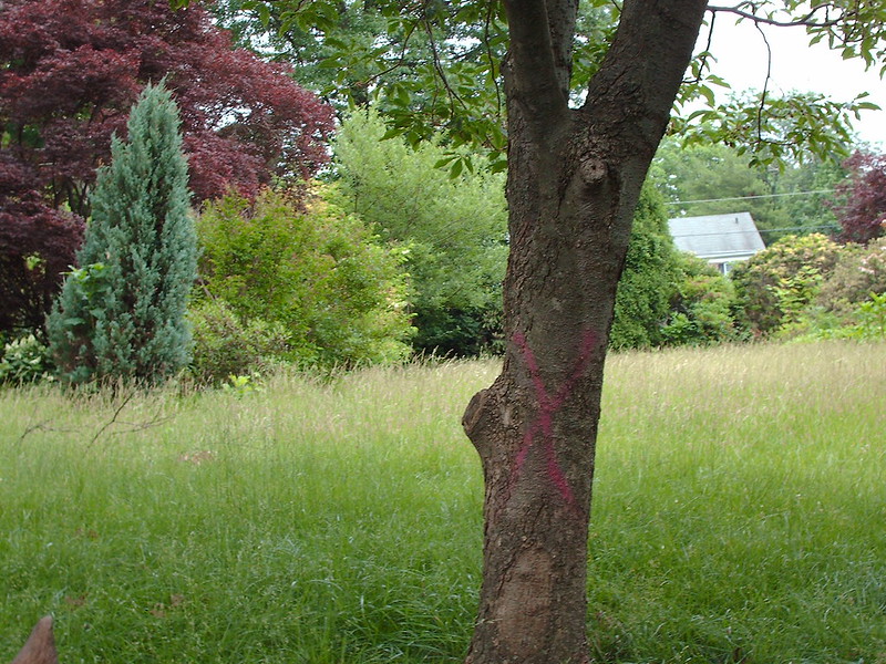As I took those photos that late May day in 2007, the houses were already empty and cleared out. They were empty shells standing there in what was quickly becoming the ruins of the gardens. Beautiful and quite large and well established Japanese Maples with their lovely trunks marked by big red “Xs” meaning soon a saw would take them down, if not simply a big bulldozer. Beautiful, healthy trees.