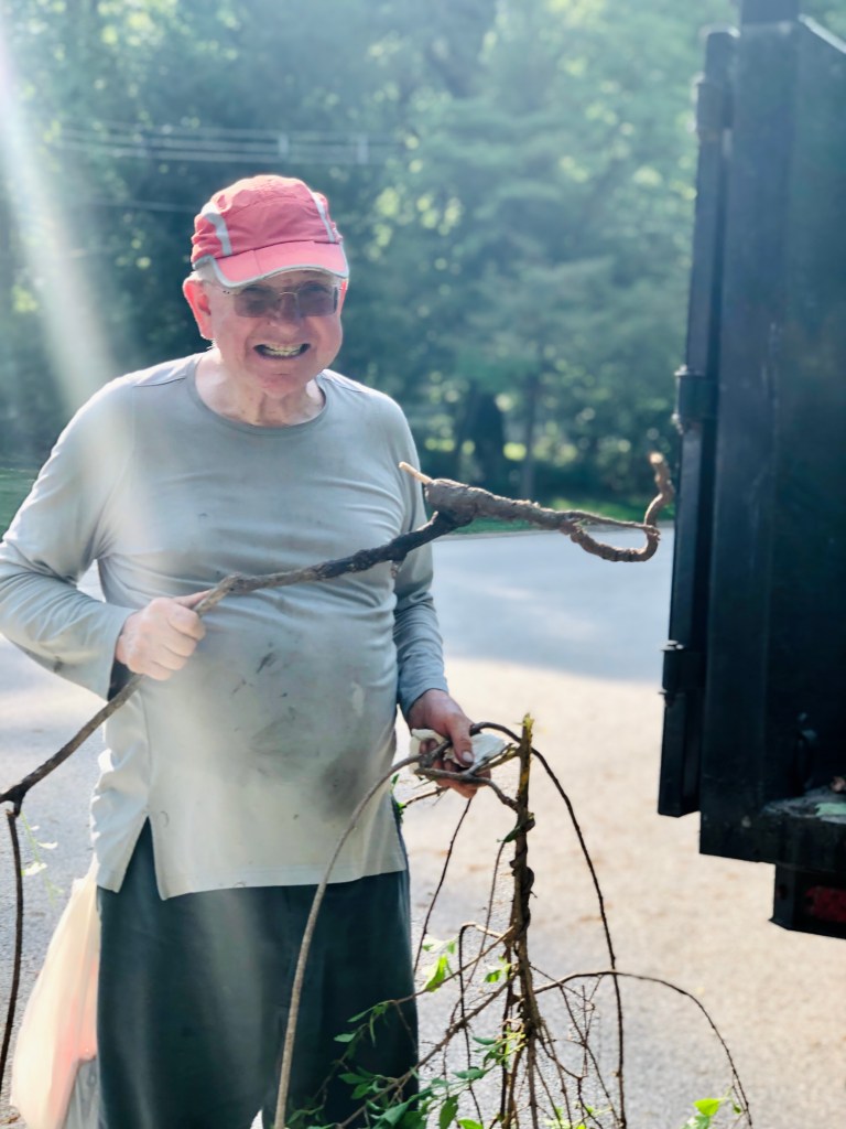 The crew was here for part one of their annual pull and remove fest on Friday. They had to stop early afternoon because of thunderstorms and also tornado warnings. That is climate change at work here where I live, because I don’t remember many tornado warnings growing up, and now we get them more often than we should. And what it means in these woods a lot of the time are straight line winds like the Derecho winds a couple of years ago which resulted in a new woodland planting bed because Mother Nature did a little cleaning out of one edge of the woods.