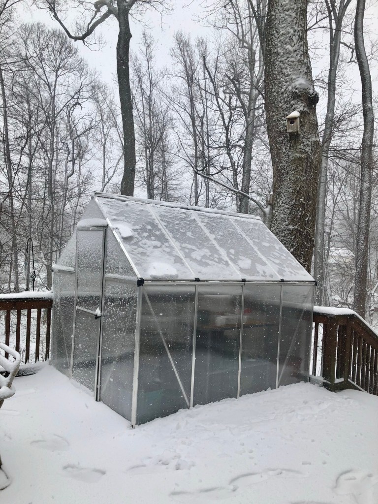I woke up this morning and realized, I wasn’t getting my day of mulching until enough snow melts. Right now it’s 27° outside and my greenhouse, fortunately, is much warmer according to my thermometer. So I won’t be opening up my greenhouse anytime soon so the heat stays in. My little greenhouse is not heated.