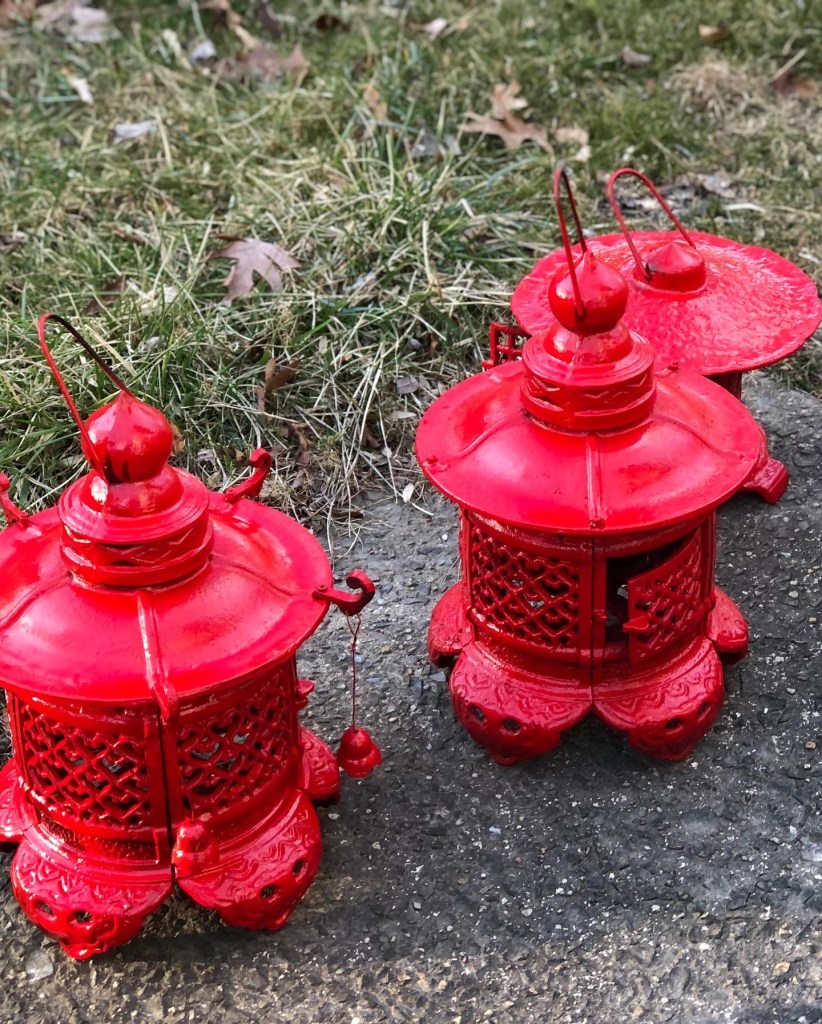 On one of the warm days this past week, I touched up my cast-iron garden lanterns. I love them. I have collected them over the years at various garage sales, essentially. I like my lanterns to be painted red. I used to spray paint them black, and for a while they were a graphite, gray, and even a dark, hunter green, but living partially in the woods with a woodland garden I decided I needed a pop of color. I do not like orange reds, so this is a blue tone red. The red cheers up these mostly dreary February days.