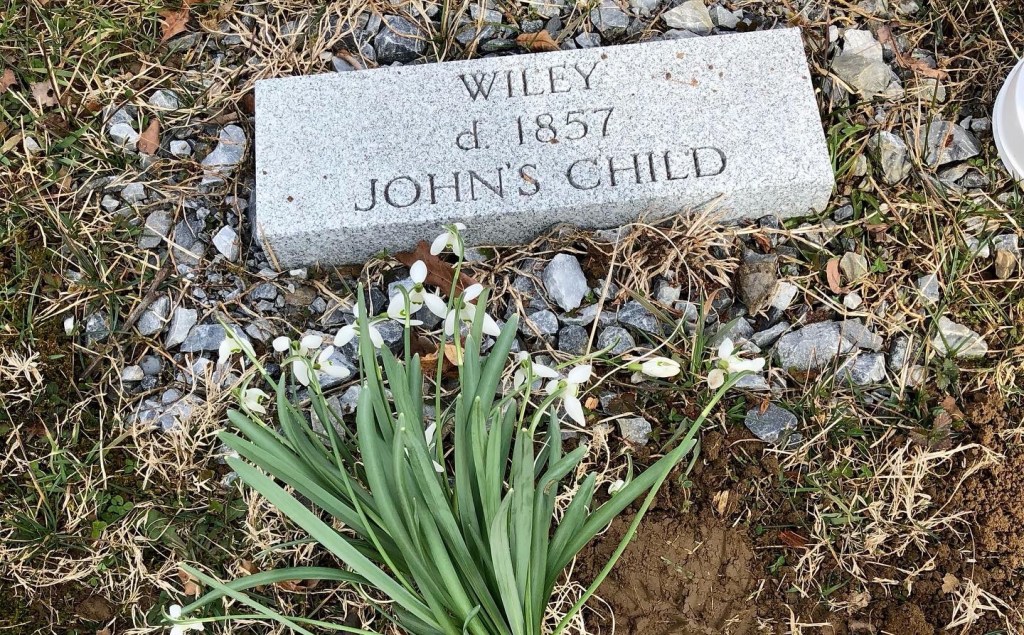 I searched the graveyard for family names belonging to my husband and didn’t find any. (I have in other Quaker graveyards.) A lot of the stones are very old and worn. So I walked the graveyard until I found the people who spoke to me. Twins who must have died in infancy. Walker and Wiley only identified as “John’s children.” I planted my two pots of snowdrops I brought with me from my garden next to those babies. It felt right.