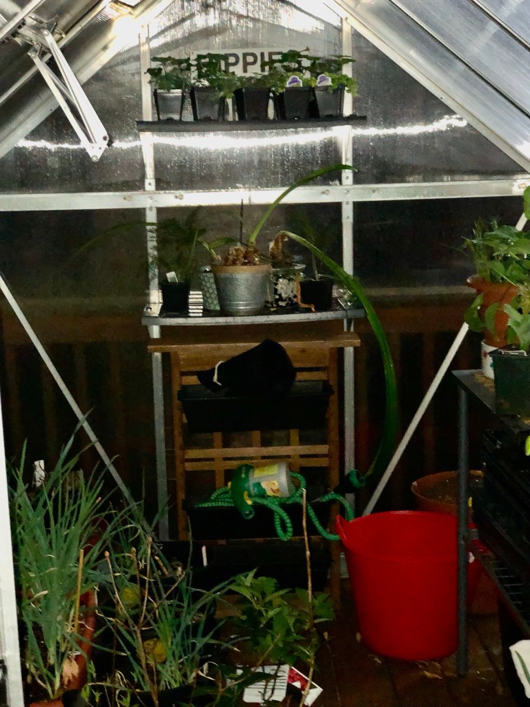 Well, here we go. It’s time for the Pennsylvania round robin of spring weather. Tonight is a frost warning. So into the greenhouse goes everything that is not in the ground. My greenhouse is not heated, but it will provide the same protection as me tarping everything, if not a little more protection.