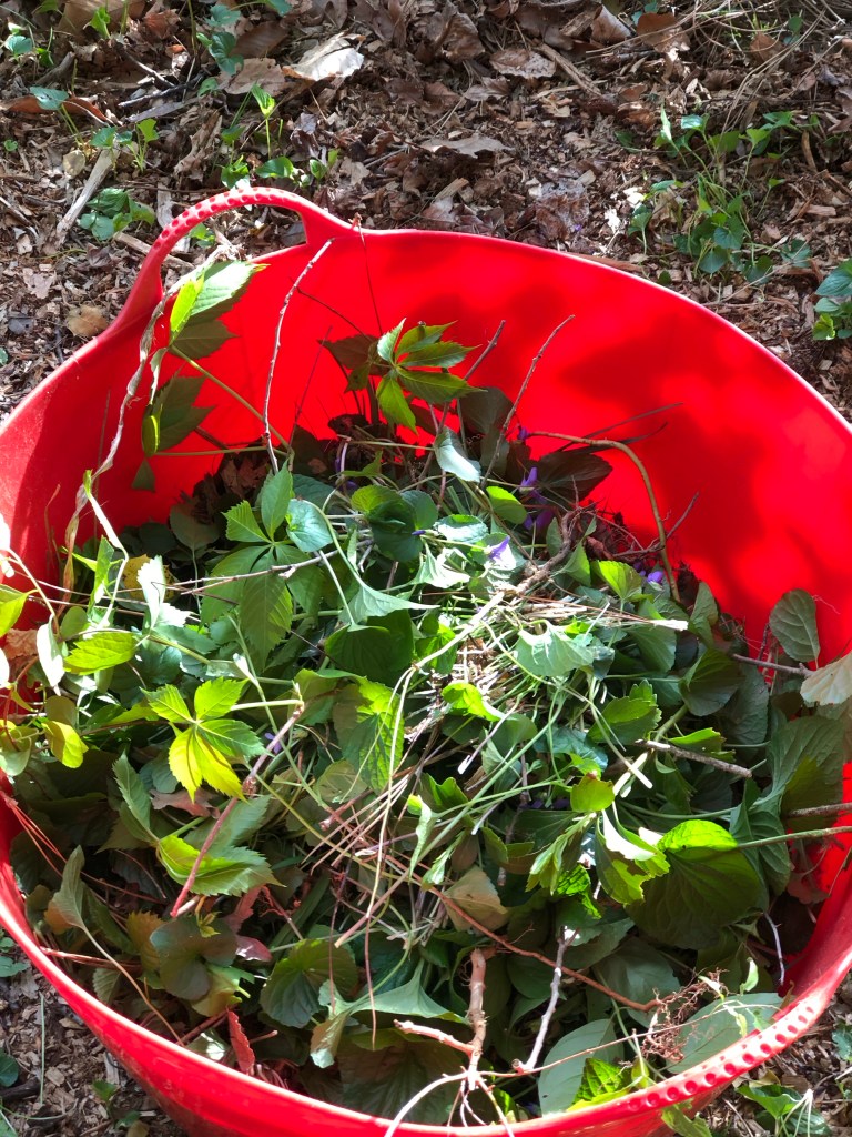 I always wear gloves when I am weeding, because even though I do pay to have poison ivy removed, it crops up, and I am very allergic to it. Poison ivy is one of those things that I actually pay to have removed from the property. Look, there are some things I can’t be penny wise and pound foolish on. Poison ivy is one of them, the other are our trees.