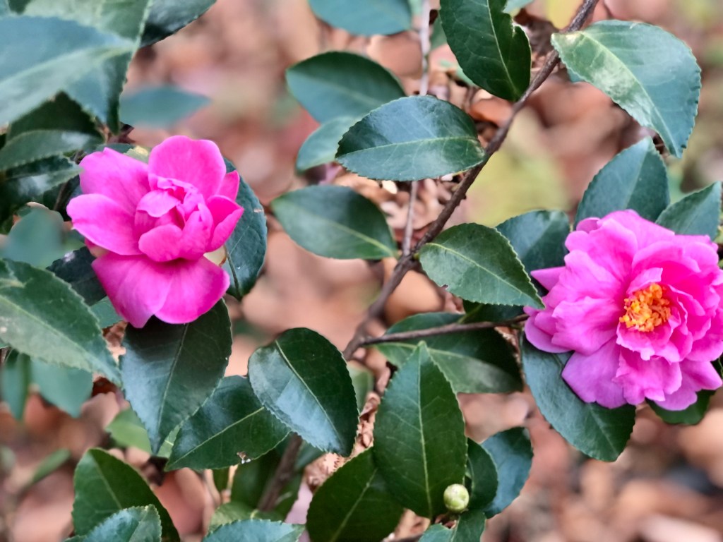 This is November in my garden. From the tall, tall, white oak, in the back of the house, to the camellias blooming and in bud , the witchhazel starting to bloom, the leaves turning on the last of the Japanese maples and a few roses still blooming, and rosemary blooming.