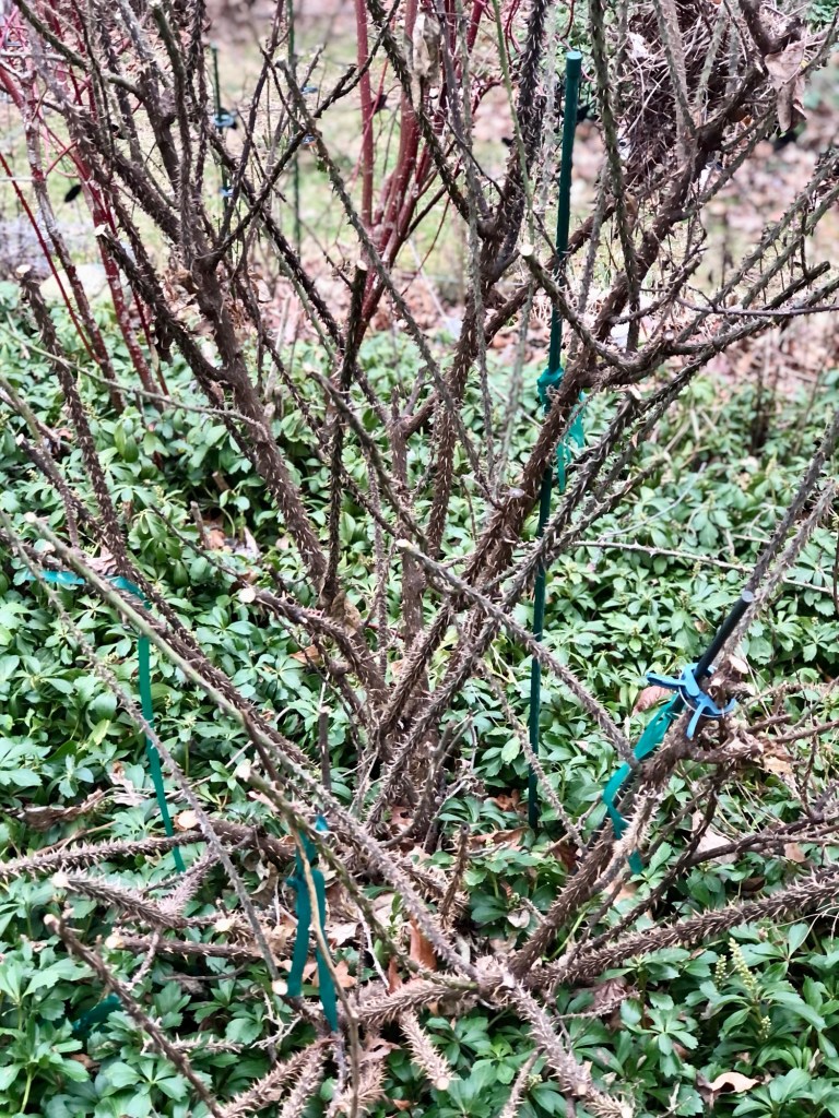 I did trim the giant rugosa fairly hard. But its own root and bare root so I think she’ll recover. This rose is Blanc Double de Coubert. It is a most prolific grower and the thorniest of my roses. But in spite of a couple of big prunings last summer and fall, it was easily 6 feet around and about 9 feet tall. I hadn’t wished to prune so hard but the recent snow and rain beat the bush down, so I had to clean the bush up.