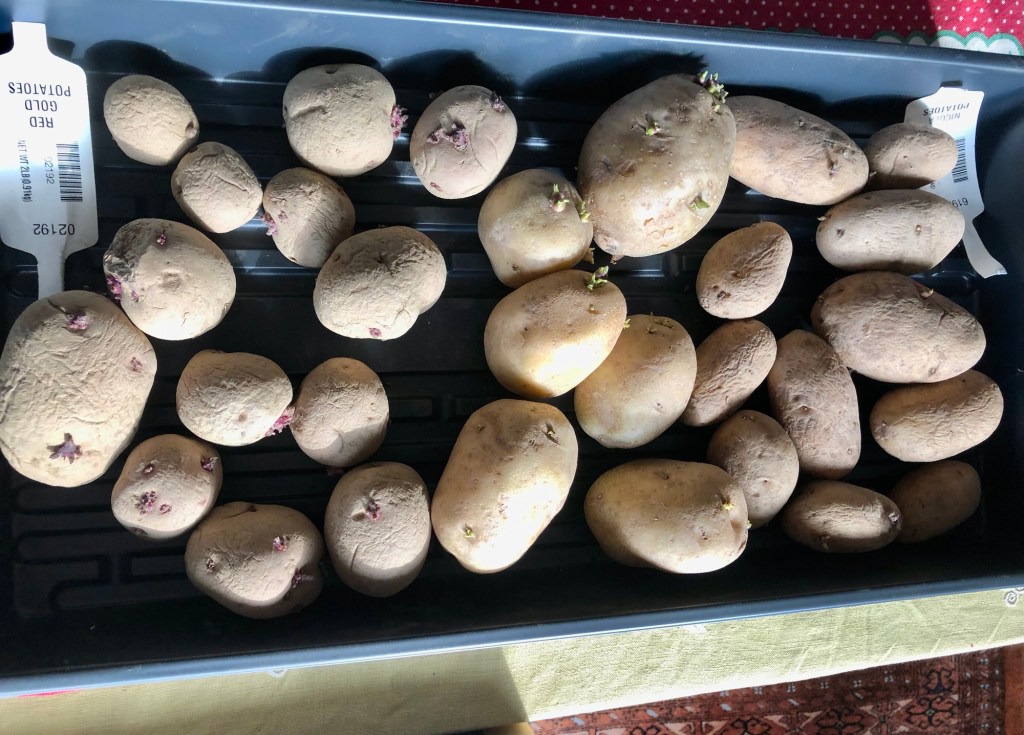 This year I am growing “red gold” and “Nicola.” I ordered them from Gurneys. However, in between the potatoes, I am chitting from Gurneys are some mystery potatoes that came in my vegetable box that didn’t get eaten right away who started to grow eyes. I have done that before and it has worked out fine and added to my potato crop.