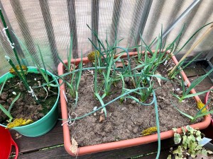 In other news, the garlic and shallots I planted last fall is all growing in the greenhouse and in the pots outside of the greenhouse. Now, eventually, they will share their pots with chili peppers I am growing, but they all seem to grow nicely together. The garlic came from Mad River Garlic and Gurneys. The shallots came from Gurneys.