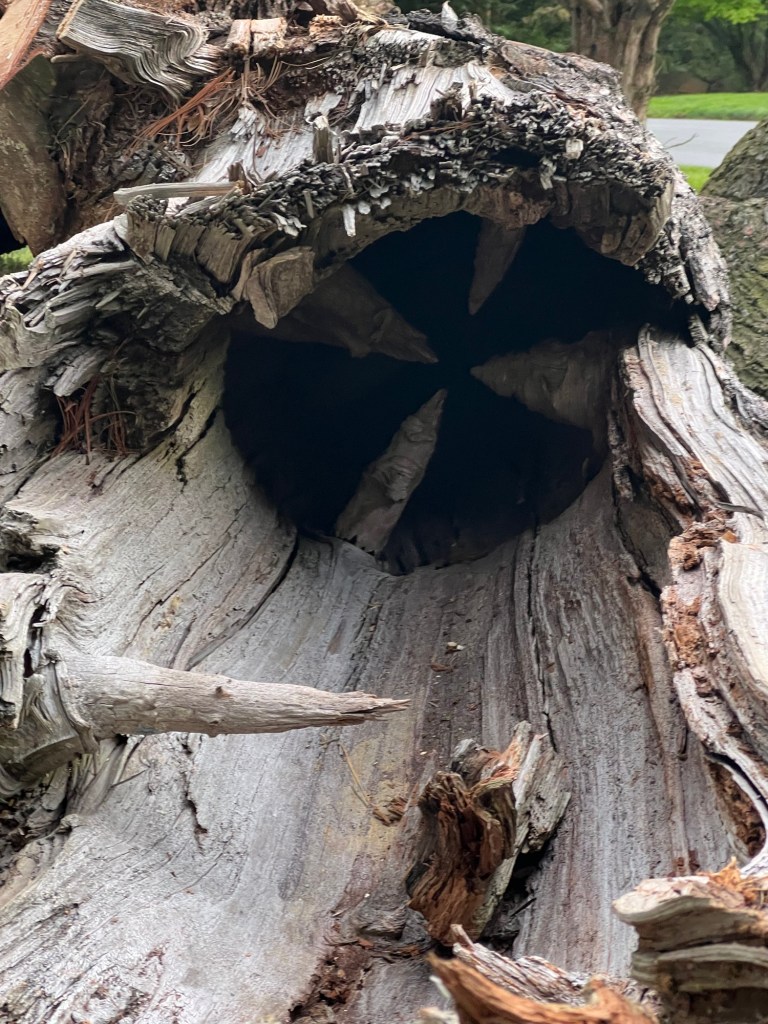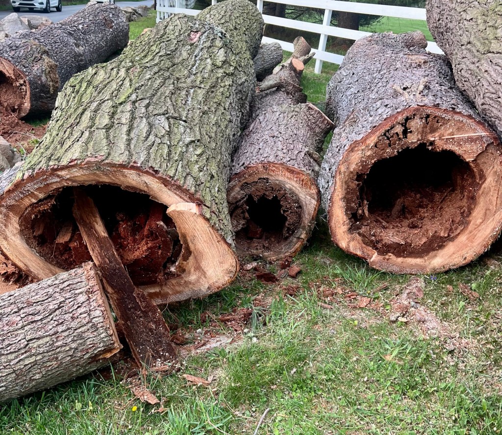 Tree work and a good arborist are essential. It has made an enormous difference here, and trees I wasn’t sure would make it are healthy and happy. To follow are photos a friend of mine took recently. A tree on a local property had to come down in an emergency situation because it was cracking as in splitting, because the property owner had ignored the fact that it needed to come down for years. The reason I’m showing you these photos is how crazy rotted it was.