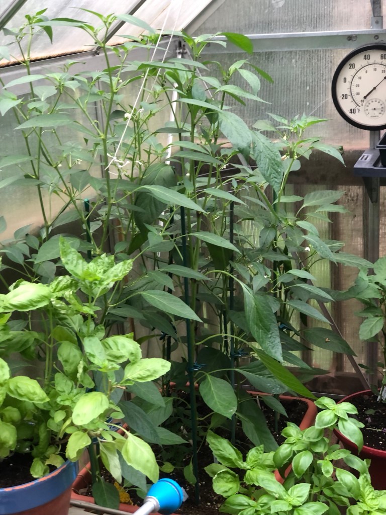 inside the greenhouse looks pretty good as well. The peppers are finally growing and the basil I grew from seed is amazing.