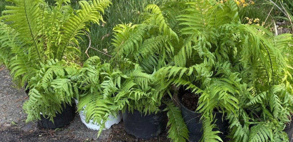 The first great ostrich fern giveaway of the season occurred yesterday. I thinned out five 3 gallon pots of ostrich ferns and gave them away.