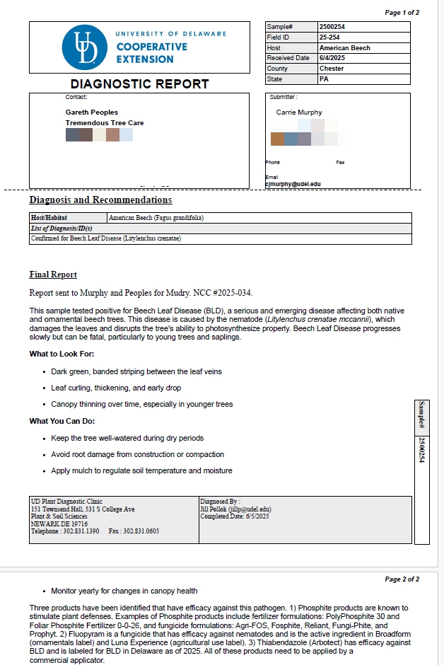 Beech Leaf Disease (BLD) is a fatal disease of beech trees, primarily caused by the nematode “Litylenchus crenatae mccannii.” (Yes I cut and pasted the nematode name!)